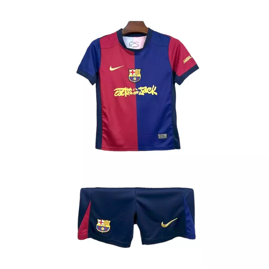 Vista seu pequeno campeão com o kit mais ousado da temporada: o Barcelona x Travis Scott. Um modelo que celebra atitude, talento e a conexão entre gerações. Não deixe essa edição especial escapar!